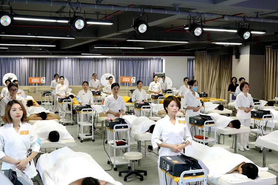 白色专属操作师服,25张铺有白色毛巾的美容床,再配以25台LifeTime操作仪器,整齐划一、简单直接。现场根据体验官的需求,按男士专场、女士肩颈、腰部、腹部专场分组,选手进行针对性的操作考核。